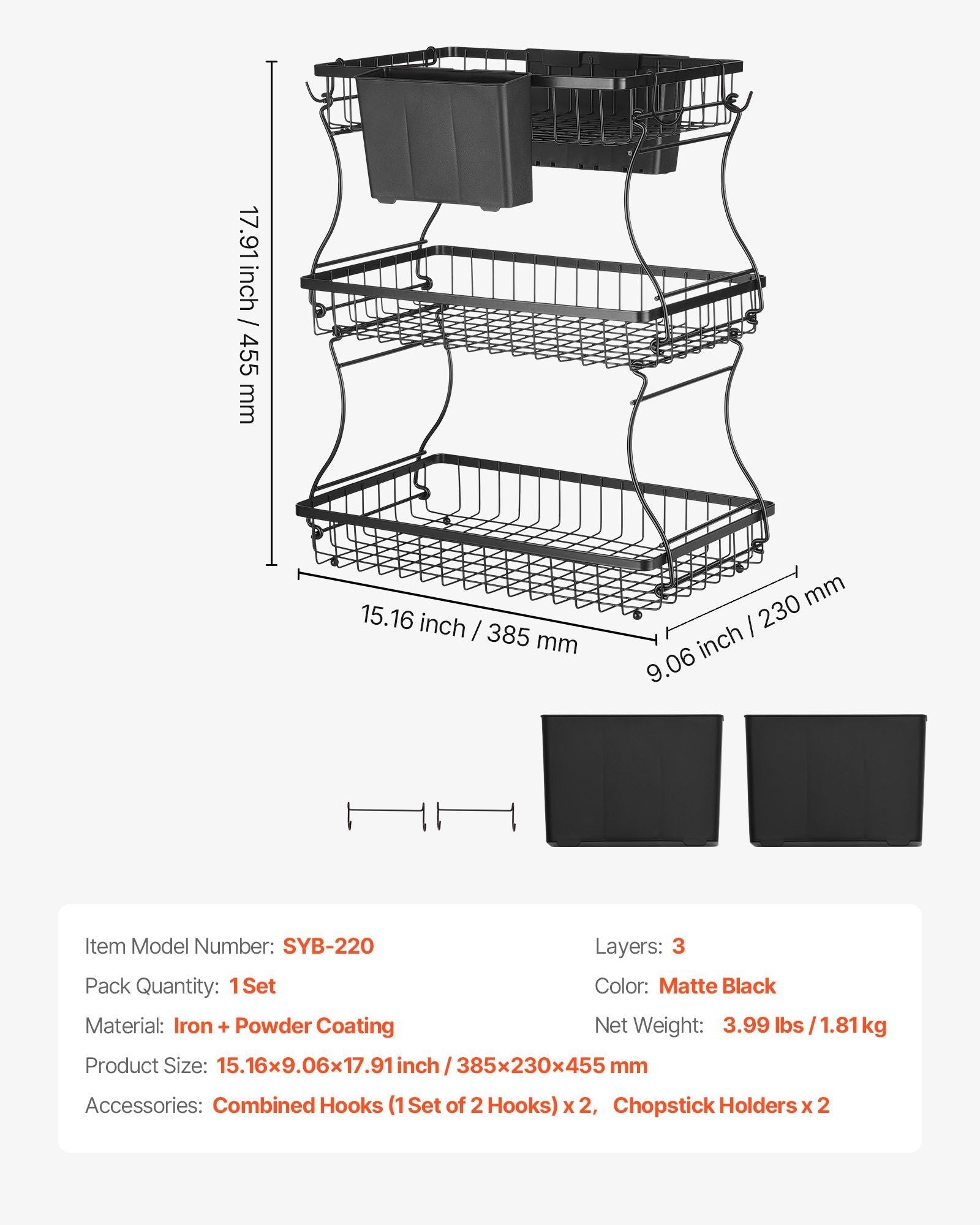 Three-layer Large Capacity: Dimension: 15.16x9.06x17.91 in (385x230x455 mm). This countertop fruit basket allows for categorized storage of fruits, vegetables, snacks, and more. Maximizes vertical space to solve clutter and keeps items organized