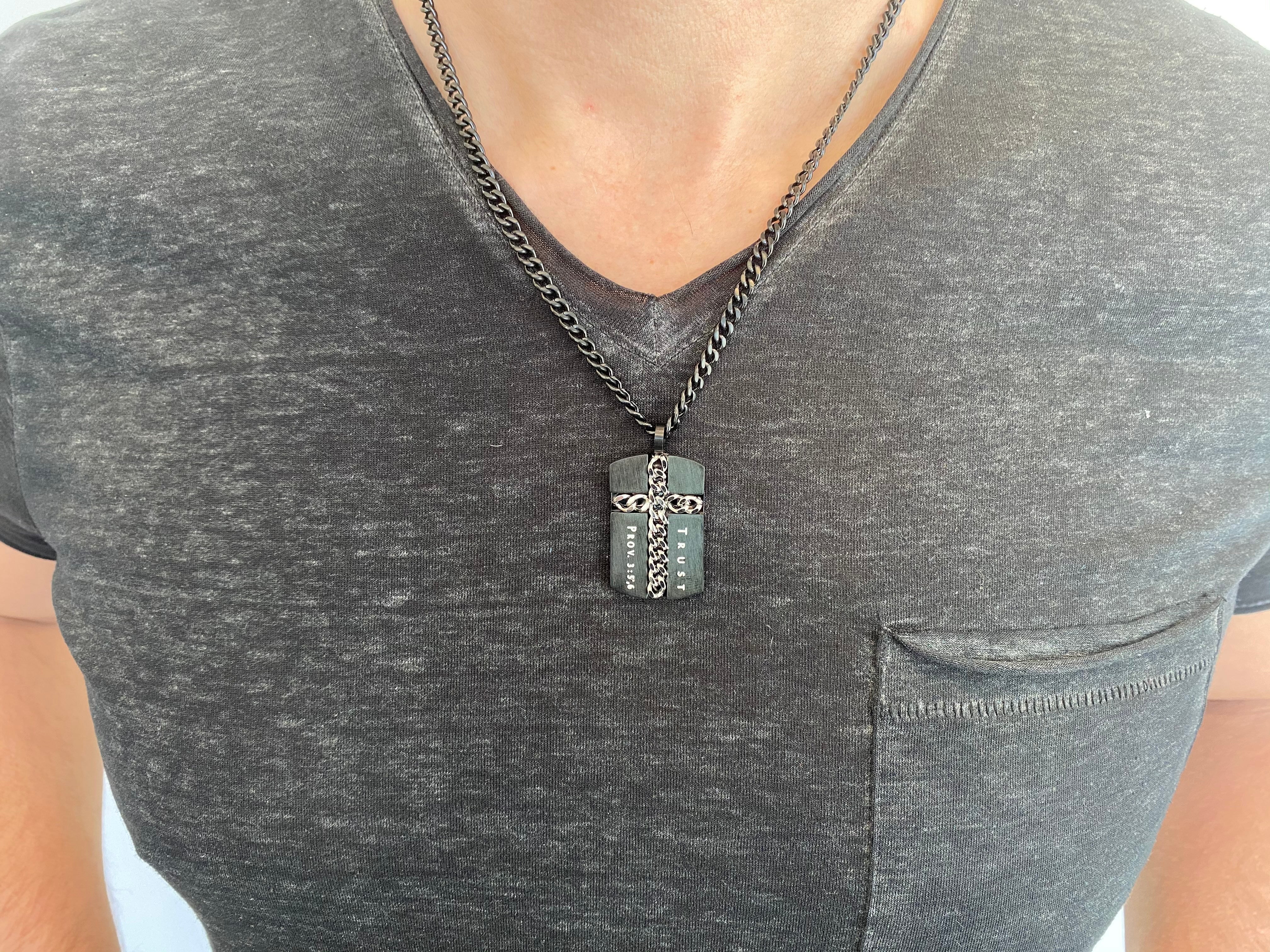 Men's Matte black stainless steel dog tag with high polished inlayed chain cross. Shield size 1 3/8" x 5/8".  Available on Matte Black 20” or 24” inch Stainless Steel Upgrade Chain. Every order comes with complimentary velvet gift bag. Orders ship in 1-2 business days from Phoenix, Arizona.