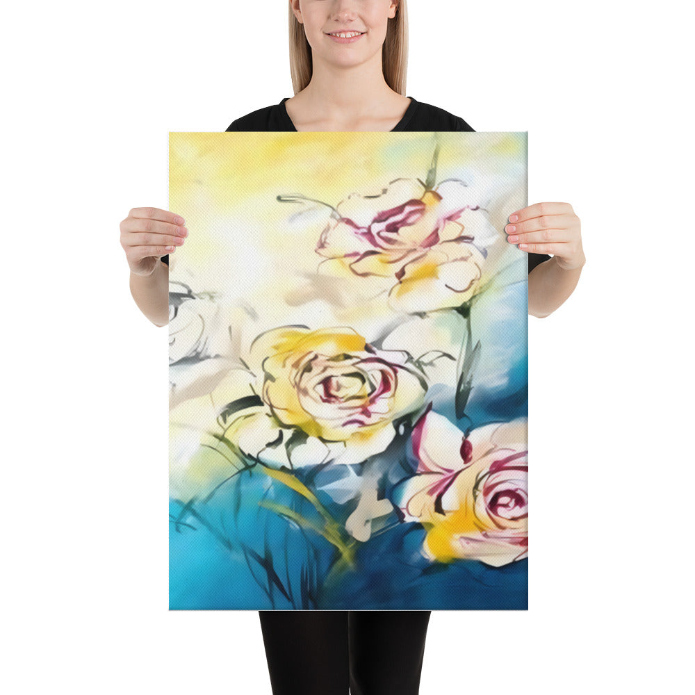 Introducing a stunning piece of wall art that is sure to capture your heart! This beautiful canvas print features three vibrant flowers in white, red, and yellow, set against a tranquil blue, white, and yellow background.