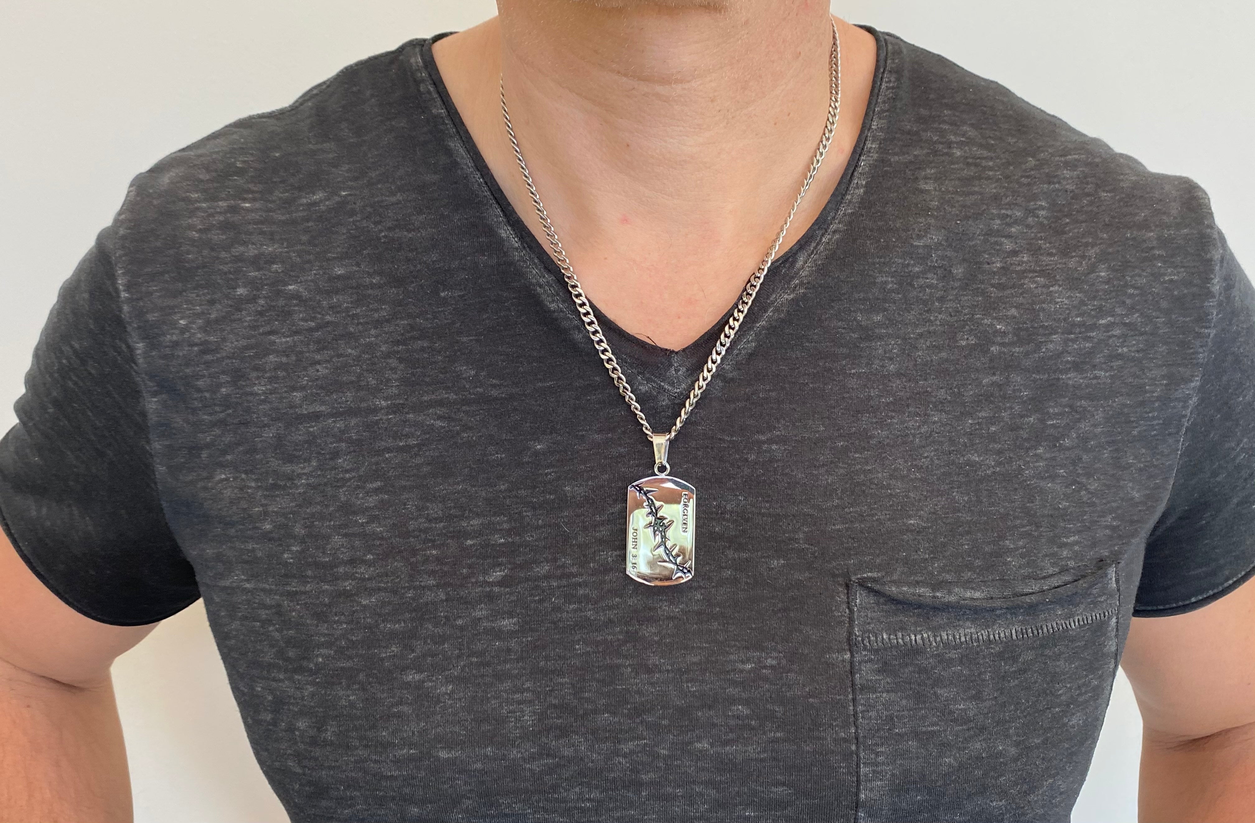 Men's Solid Stainless steel high polished “Crown of Thorns Dog Tags” with 2 sided engraving and black enamel filling. Dog Tag measures 1 ½” x ¾”. Every order comes with complimentary velvet gift bag. Orders ship in 1-2 business days from Phoenix, Arizona.