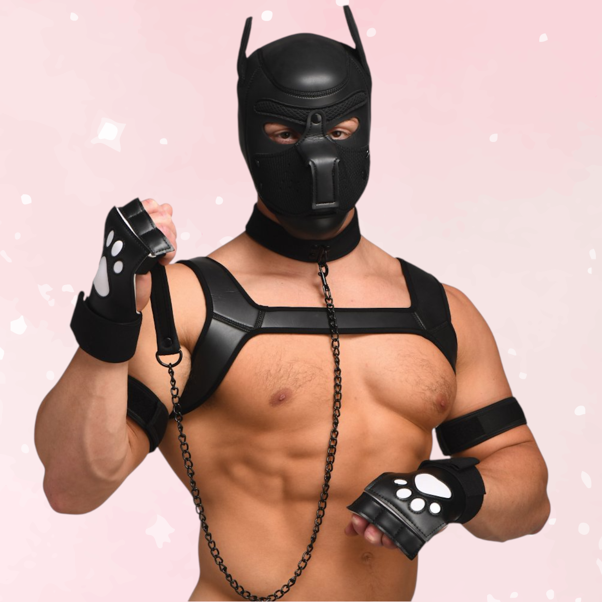 This complete puppy play kit includes everything you need to embrace your pup persona: a adjustable neoprene hood with poseable ears and a removable muzzle, a wagging silicone tail plug, a chewable bone gag, an adjustable vegan leather collar and leash, a stretchy bulldog harness, velcro armbands, paw mitts, and even a doggy-style position strap for immersive intimate play.