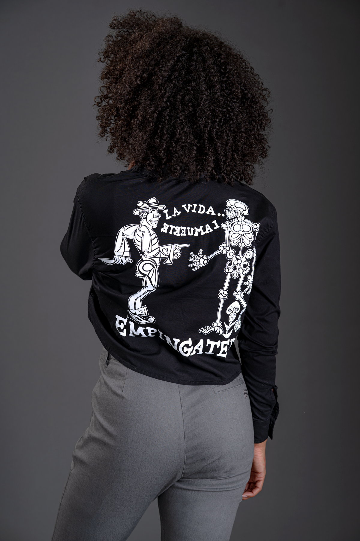 In collaboration with world renowned artist Carlos Luna, the Empingated Midi Button-Up brings the powerful themes of life, death, and the human struggle for survival to life. The artwork on this garment is directly taken from Luna’s work Empingated, which depicts an anthropomorphic man in a jungle of life experiences, facing his own mortality. As death reaches out with an embrace, the man hides a knife, hoping to fight against the inevitable. The cyclical nature of life and death is symbolized by the phrases “La Vida” (Life) and “La Muerte” (Death). The design also includes the anglicized Cuban explicative “Pinga,” highlighting the intensity of this existential conflict. This piece is a striking reminder of our shared mortality and the complex forces at play in our lives.
