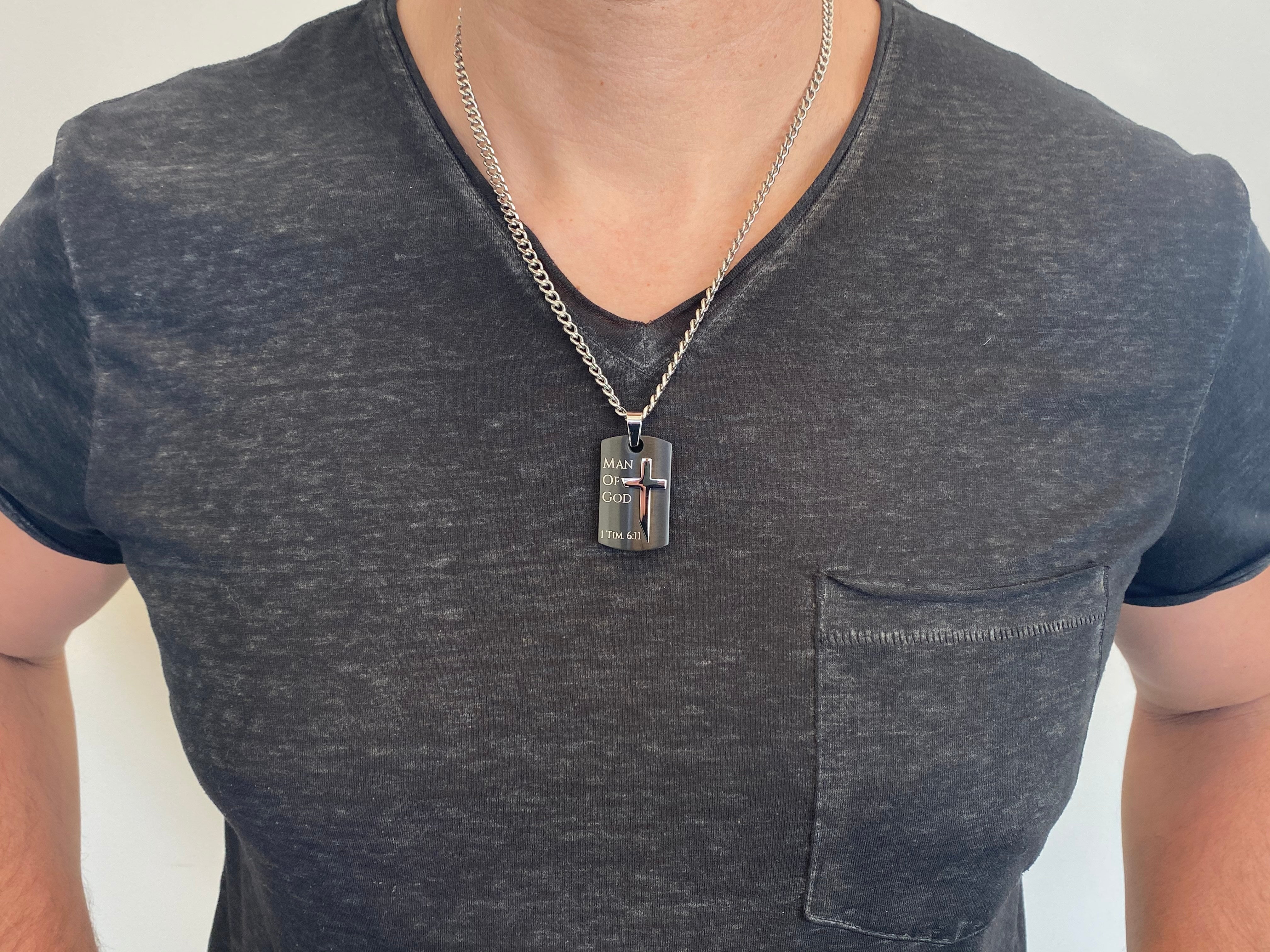 Men's Solid and weighty, stainless steel Pendant. Front side has high polished angle cross embedded into black padlock.  Front side reads laser engraved scripture of choice.  Measures 1 1/2" x 1" x 1/4" thick. Available on 20” or 24” stainless steel high polish no tarnish curb chain. Every order comes with complimentary velvet gift bag. Orders ship in 1-2 business days from our distribution center Phoenix, Arizona.