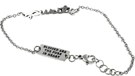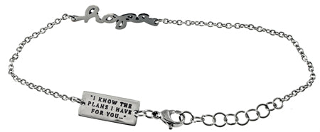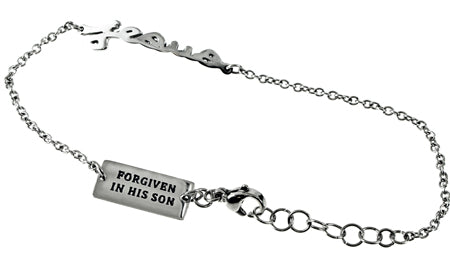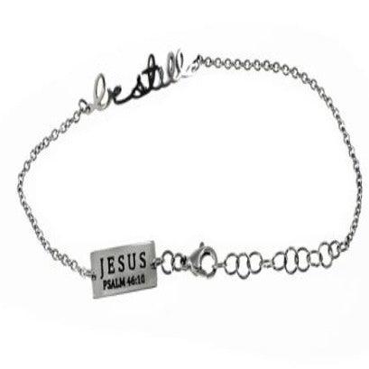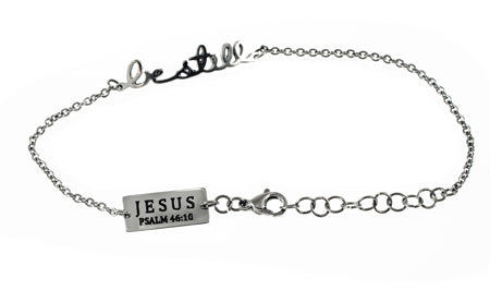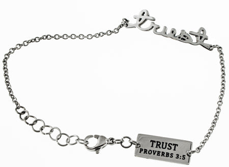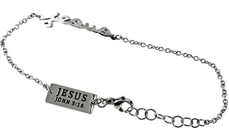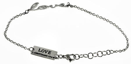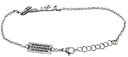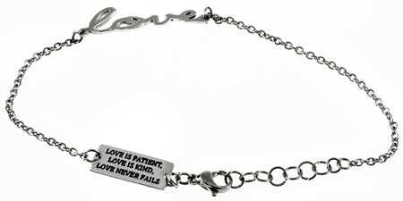 Women's stainless steel hand writing bracelet. Cut out hand writing reads the scripture of choice. Fully adjustable to fit 7”-8” by linking lobster claw clasp through desired loop. Every order comes with complimentary velvet gift bag. Orders ship in 1-2 business days from Phoenix, Arizona.