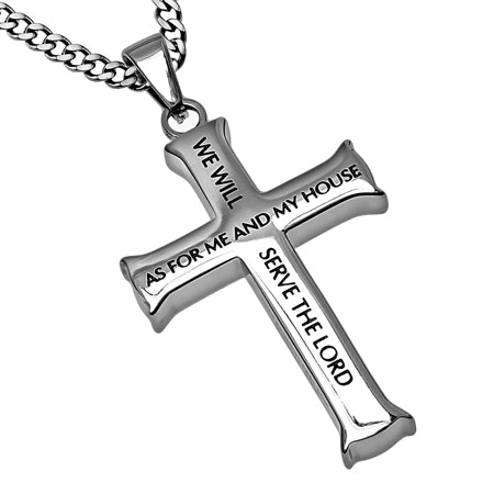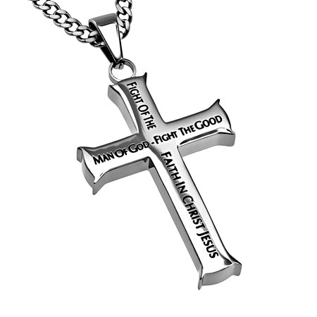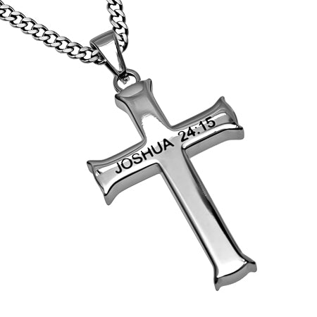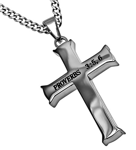 Men's Solid Stainless Steel cross with high polish finish. Front and back Scripture engraving with black filling. Cross size 1 3/4" x 1". Every order comes with complimentary velvet gift bag. Orders ship in 1-2 business days from Phoenix, Arizona.