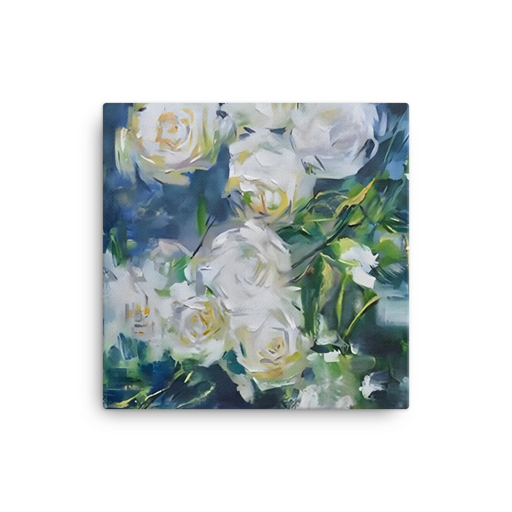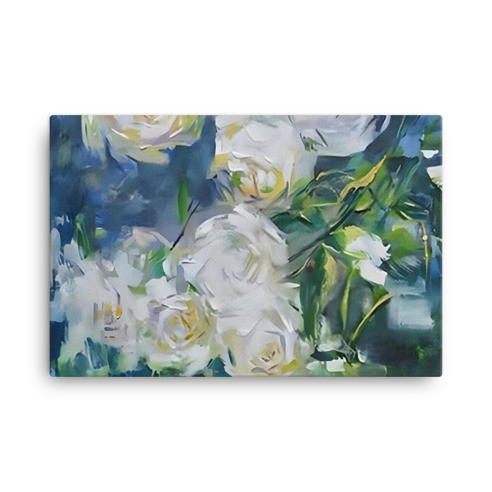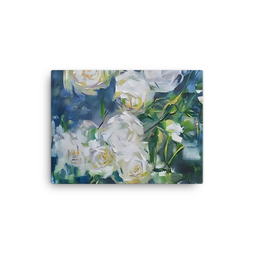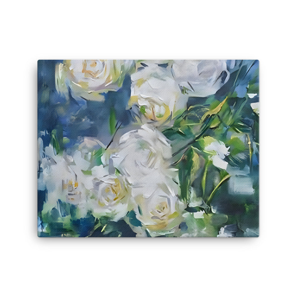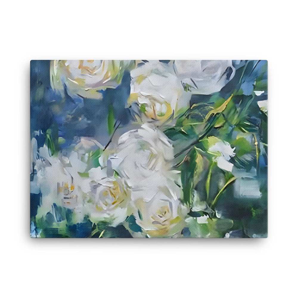 Whether you're looking for a statement piece to complete your living room decor or a soothing addition to your bedroom, this "Ten White Roses in Blue and Green" canvas print is sure to impress.