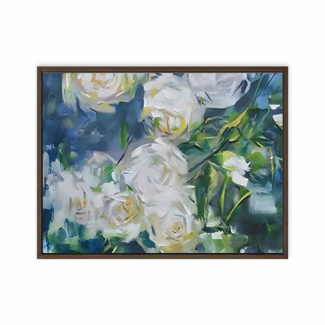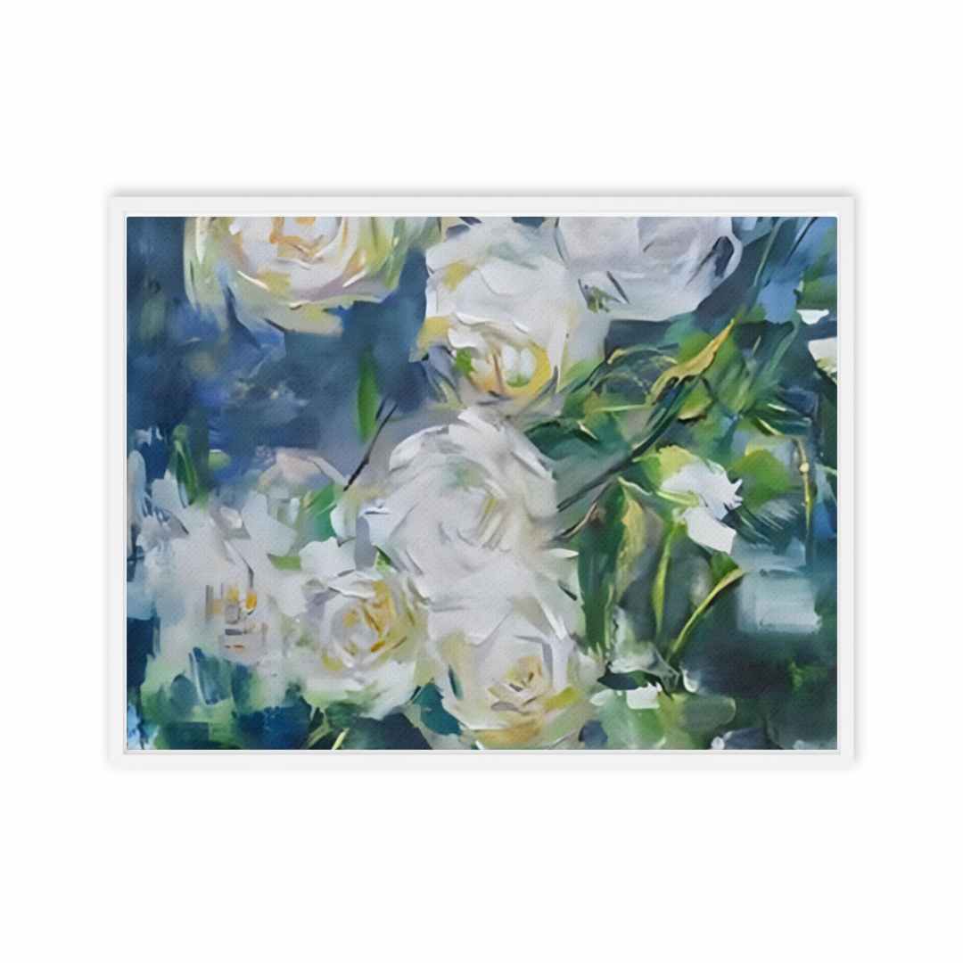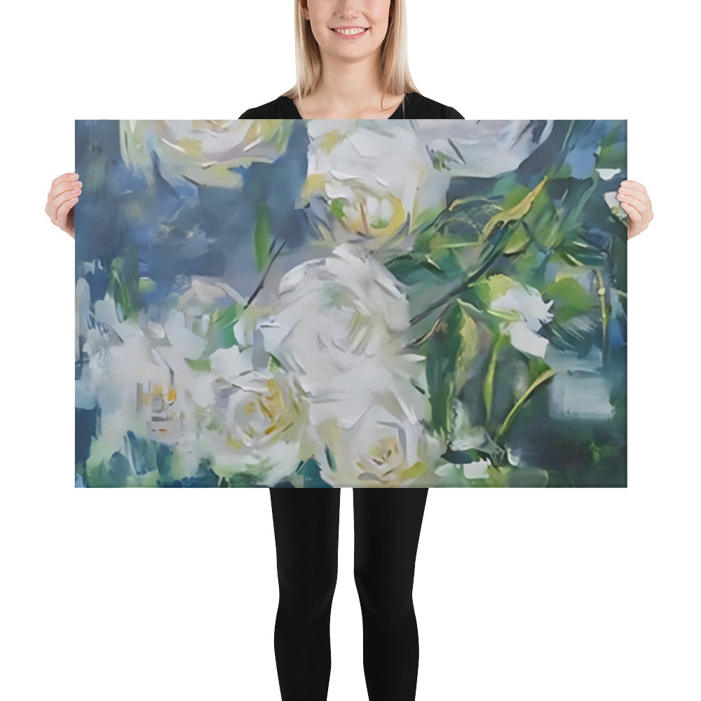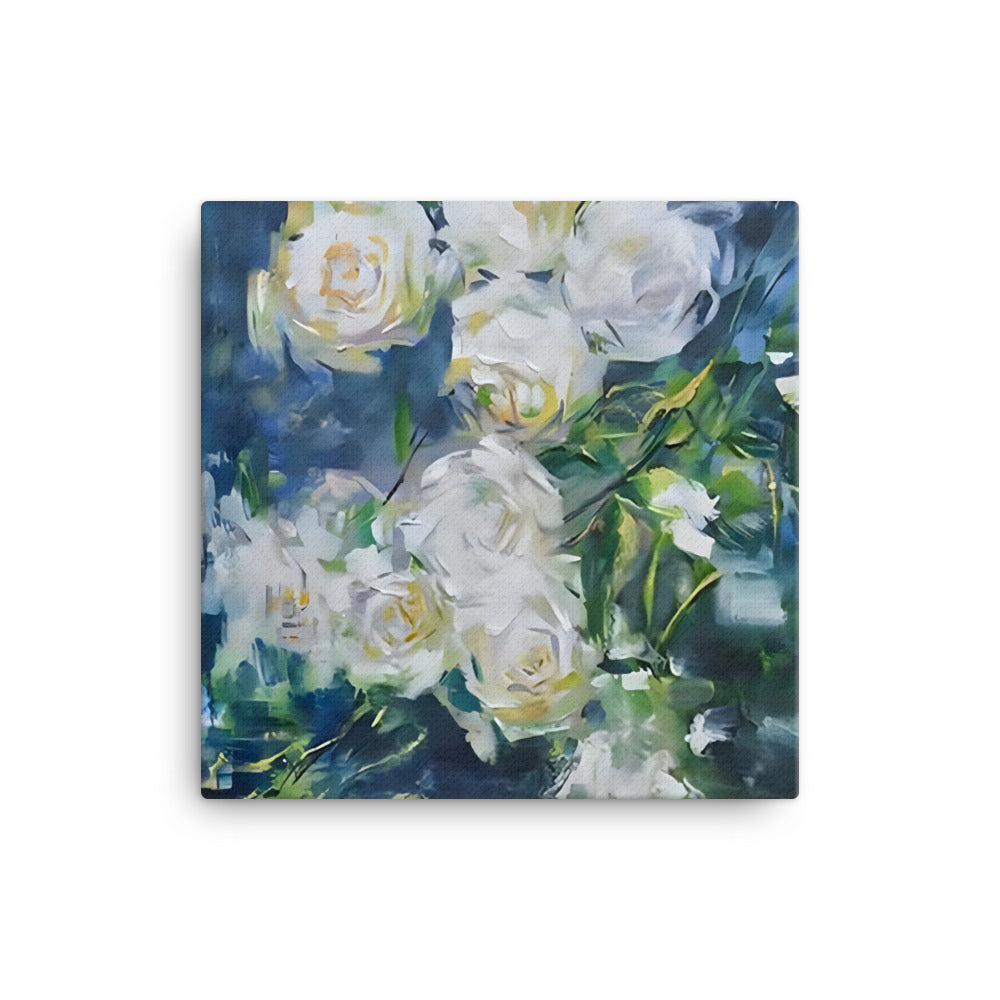 Whether you're looking for a statement piece to complete your living room decor or a soothing addition to your bedroom, this "Ten White Roses in Blue and Green" canvas print is sure to impress.