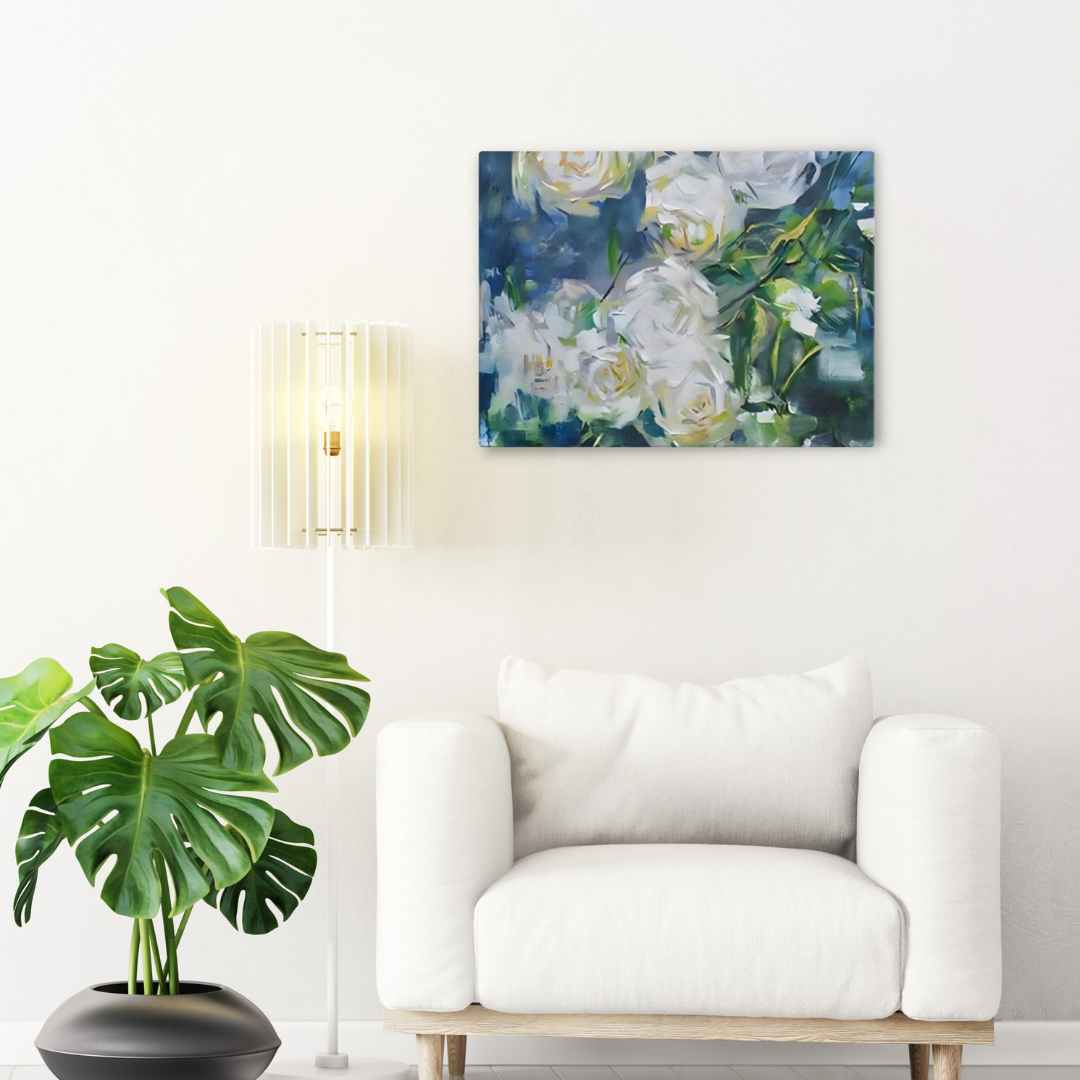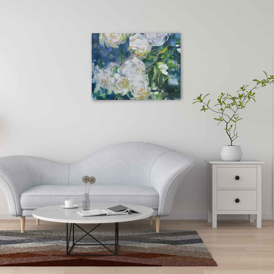 Our "Light in Spines" canvas print is the perfect way to bring a touch of nature into your home. This stunning oil painting features ten white roses against a background of blue and green hues with a touch of yellow, creating a tranquil and serene atmosphere in any room.
