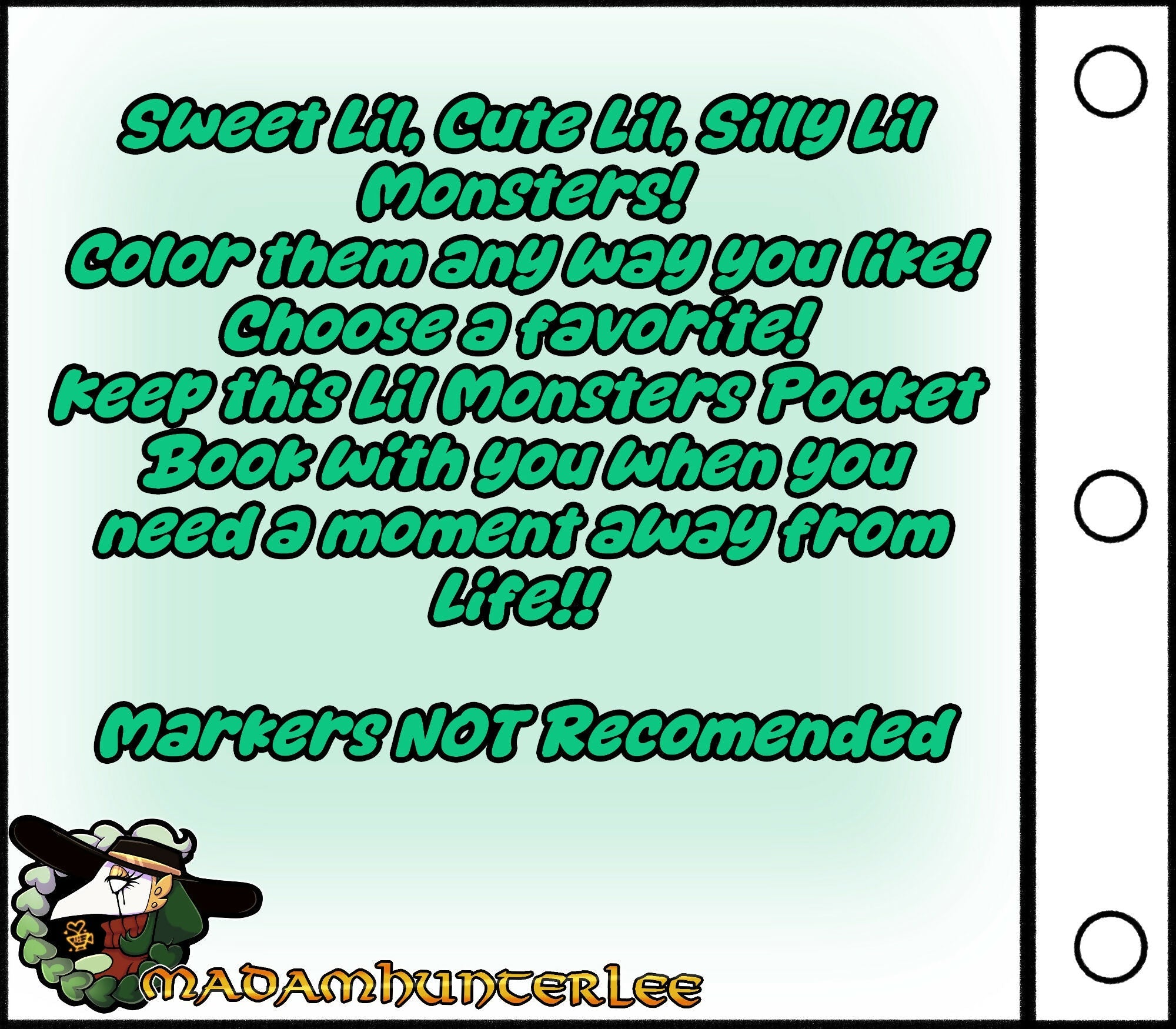 Keep this Lil Monsters Pocket Coloring Book with you when you need a moment away from Life! Markers NOT Recommended"