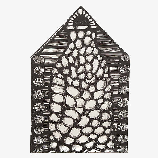 • Illustrated fabric print of logs, stone chimney, and "hinged" door