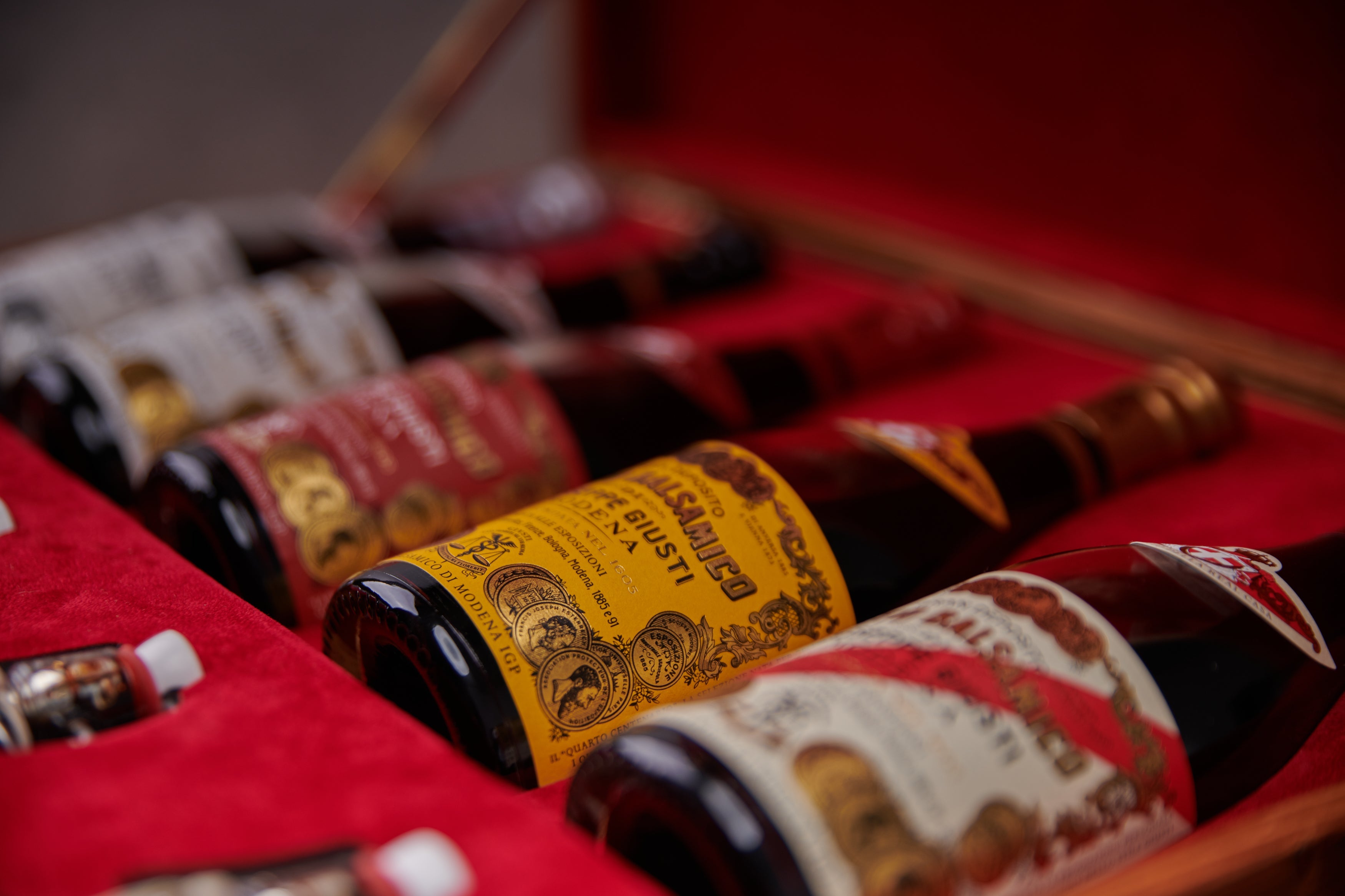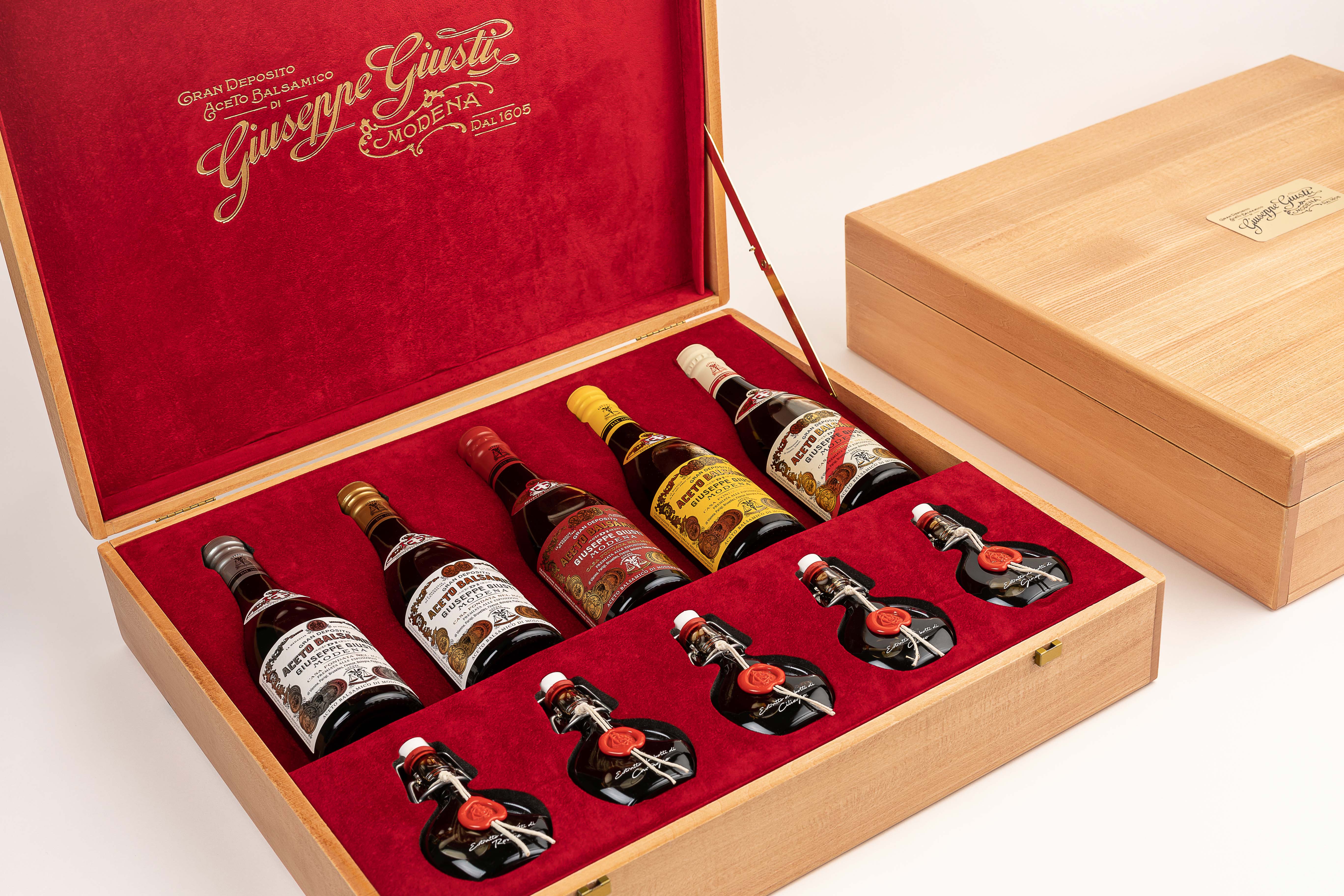 Luciano Pavarotti requested a single object of great value for a charity auction, organized by the Luciano Pavarotti Foundation. The Giusti family created the “Scrigno”, a precious wooden box containing the entire historical collection in the classic “Champagnotta” bottle, alongside five premium condiments with Balsamic Vinegar of Modena aged in single barrels of oak, cherry, chestnut, mulberry and juniper.