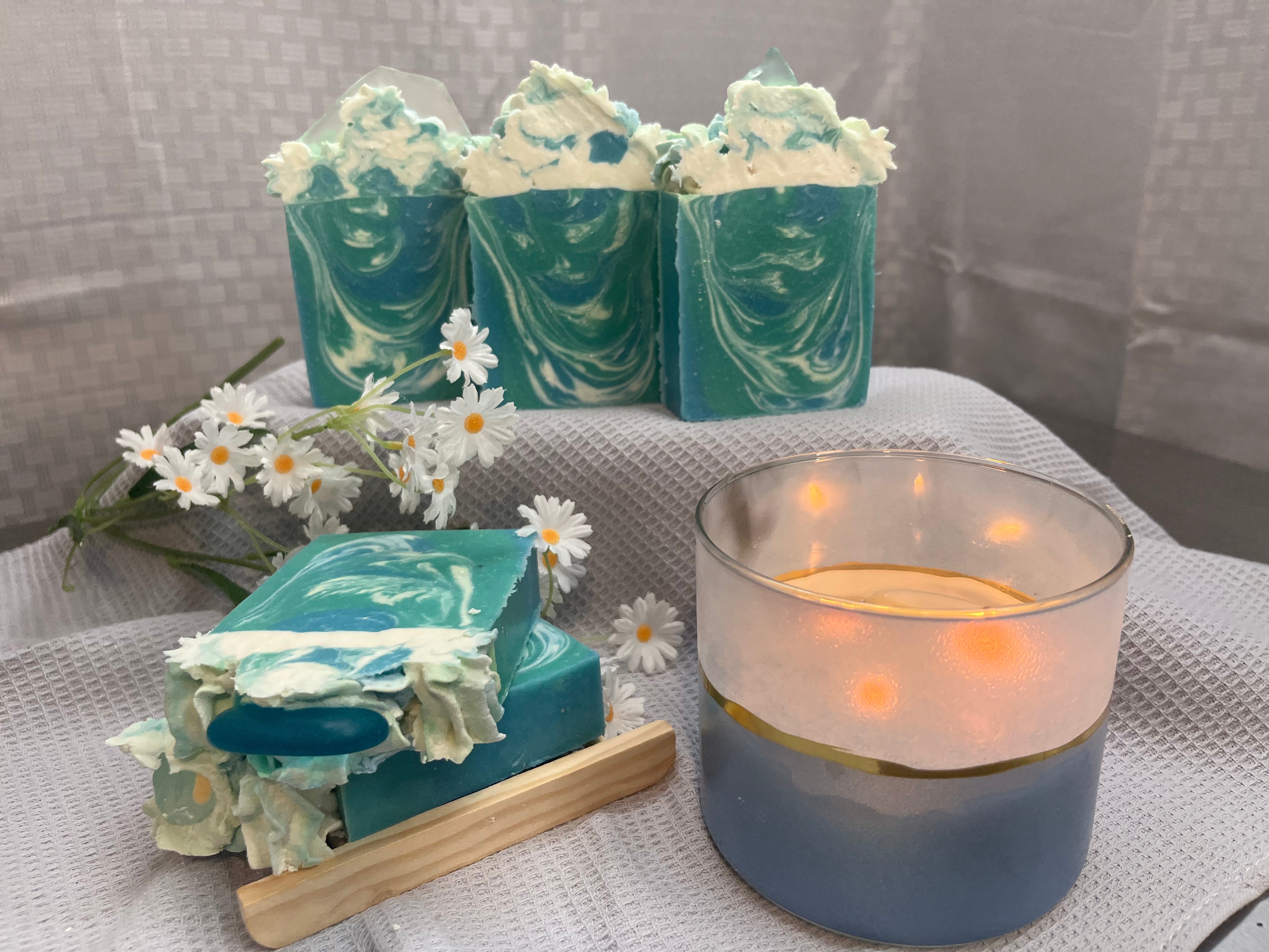 Looking at, and breathing in the scent of, this beautiful soap will convince you that you are sitting seaside. The soap frosting on the top is meant to simulate the rolling sea foam atop waves lapping the shore; and each piece comes with a real piece of sea glass embedded on the top. This soap makes a beautiful gift, or would be a great treat for yourself. This soap is 100% and your skin will love the perfect balance of natural oils and butters.