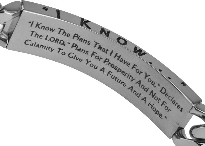 Men's Solid 316L stainless steel high polish bracelet with lobster clasp. Fully engraved on all 4 sides with black enamel filling. Bracelet is 8” in length (standard men’s fit) and weighs a full 75 grams. Every order comes with complimentary velvet gift bag. Orders ship in 1-2 business days from Phoenix, Arizona.