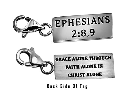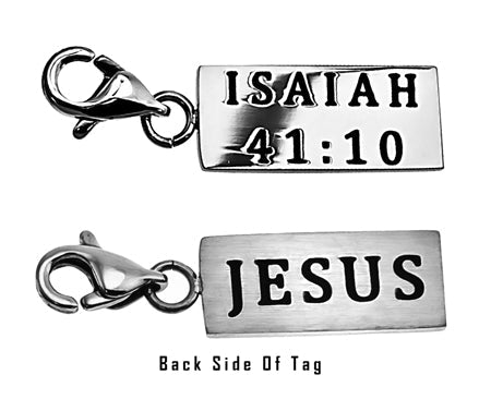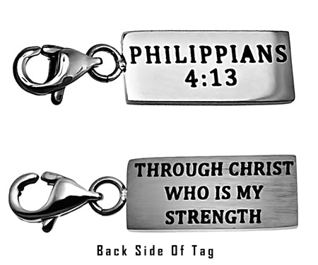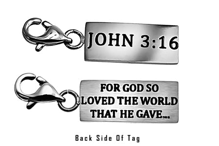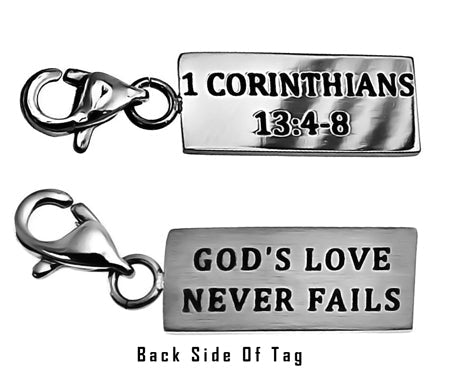 Women's Stainless Steel Necklace with brushed and polished double sided mini charms and CZ Cross pendant. Polished charm reads Scripture of Choice.  Included is 18” stainless steel chain with lobster claw clasp. Charm dimensions are ¾” x ¼”. Every order comes with complimentary velvet gift bag. Orders ship in 1-2 business days from Phoenix, Arizona.
