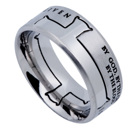 Men's Brushed stainless steel ring with high polished split half cross on one side and half cross on the alternate side. Engraved and enamel filled. Every order comes with complimentary velvet gift bag. Orders ship in 1-2 business days from Phoenix, Arizona.