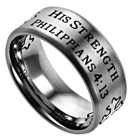 Men's Brushed stainless steel silver double cross ring with high polished crosses. Laser Engraved Scripture of choice. Every order comes with complimentary velvet gift bag. Orders ship in 1-2 business days from Phoenix, Arizona.