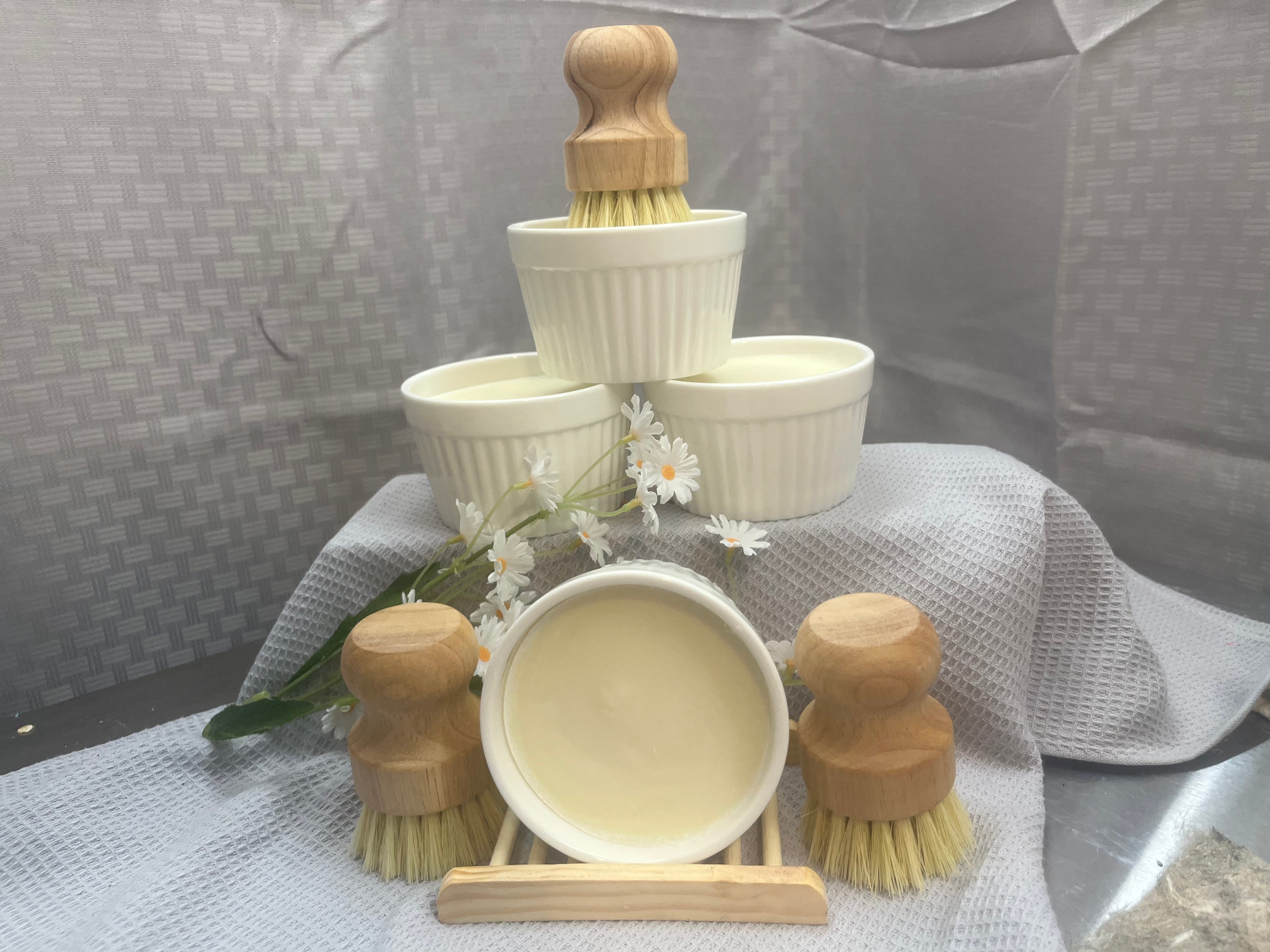For your first purchase, we suggest our 'starter set' which gives you a 6 oz solid dish soap in a reusable ceramic ramekin. You also will be getting a scrub brush with a bamboo wooden handle and natural sisal bristles. When you use up your first solid dish soap (which could take 4-5 months!), you can order one of our refills (no ramekin); or another ramekin-filled dish.